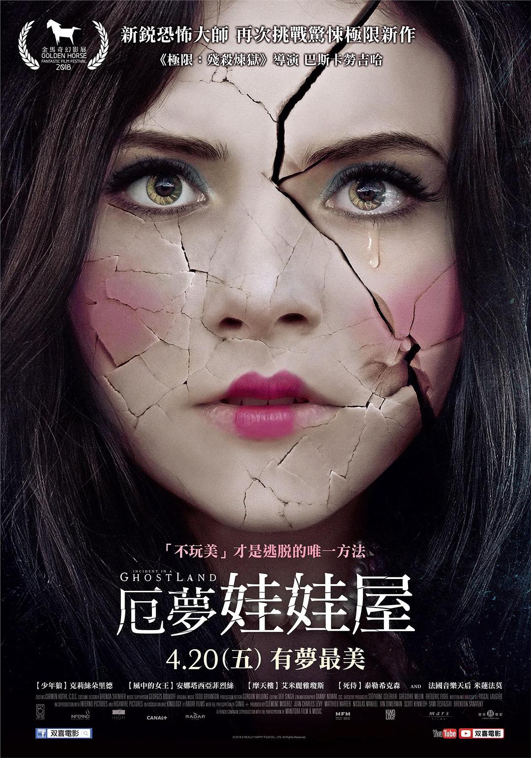 《极限:残杀炼狱》法国鬼才导演巴斯卡劳吉哈的新作《厄梦娃娃屋》,再次打造超越类型的狂想惊悚,讲述从小立志成为恐怖小说作家的女孩,全家在搬入一栋旧宅的当晚遭受暴徒袭击,虽死裡逃生,姊姊却性情大变,她将恐怖经历改编成作品成为人气作家,原以为儿时梦魇已事过境迁,没想到更多秘密与危机正伺机而动。恐怖元素一应俱全,密室虐杀、血浆喷发、鬼影幢幢,奇招尽出却绝非形式卖弄,超乎预期的剧情转折令人馀韵无穷。